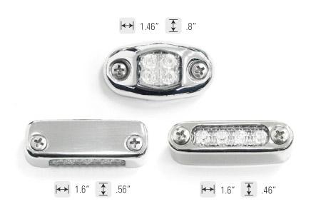 We packed four of the latest LED devices in the smallest package possible while maintaining the LEDs at their proper operating temperature. As a result our product outperforms competitive products in both light output and cost. The inner lamp body is made from automotive grade high impact polycarbonate that is sealed with our proprietary urethane potting, insuring years of trouble free service. Offered in a wide array of light colors the durable inner lens body is sold separately from the high quality stainless steel cases. The corrosion resistant stainless steel cases are available in three styles and three finishes including high polish as well as black and white powder coat. Colors available: White, Deep Red, Red, Orange, Yellow, Green, Jade, Blue, Ultra Violet |